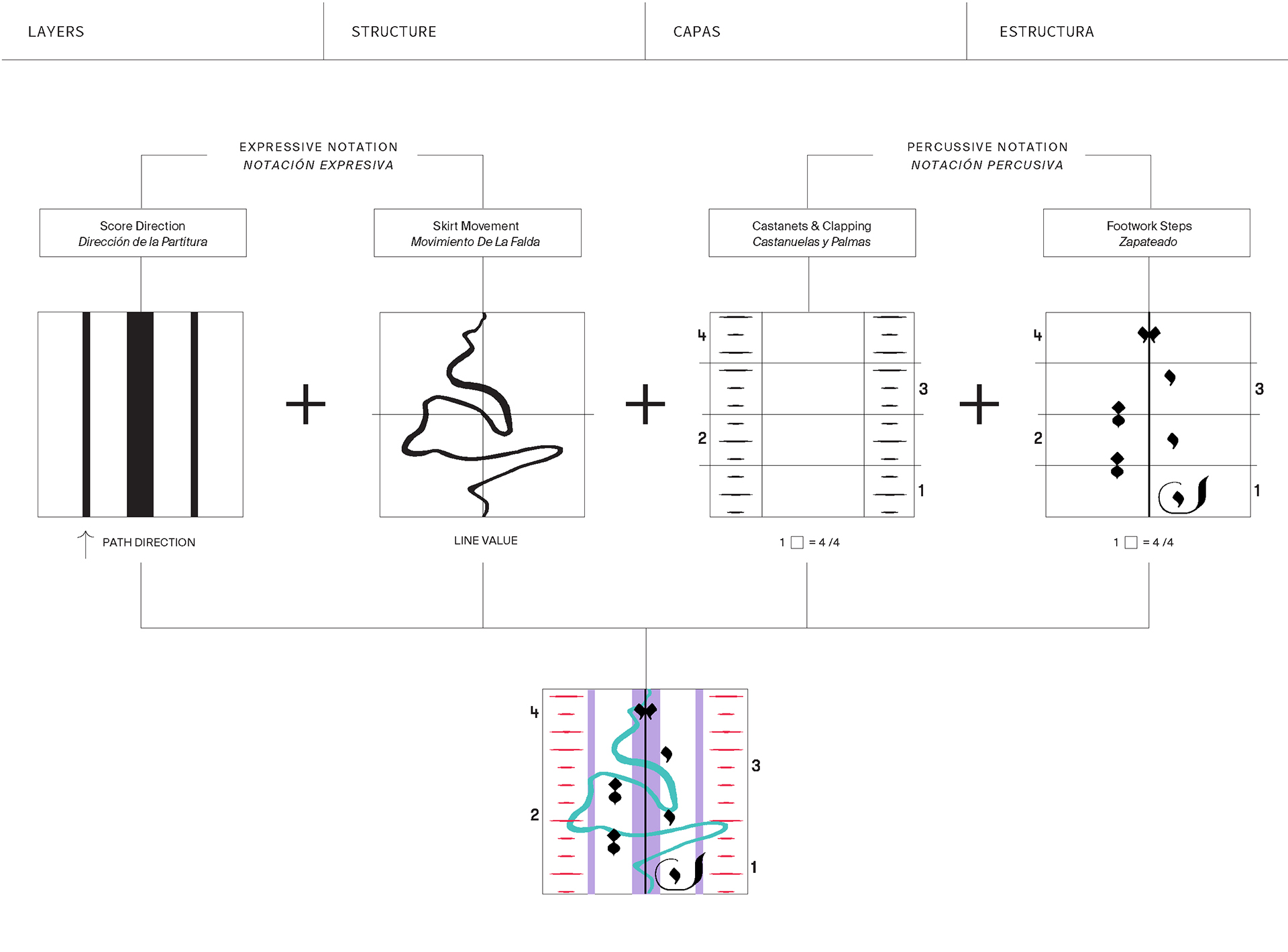 —The system consist in four Layers that work as fonts (Layer 1, 2, 3, 4). This layers create a variety of ornamental composites by superimposing and also the meaning of the choreography and the dance steps.